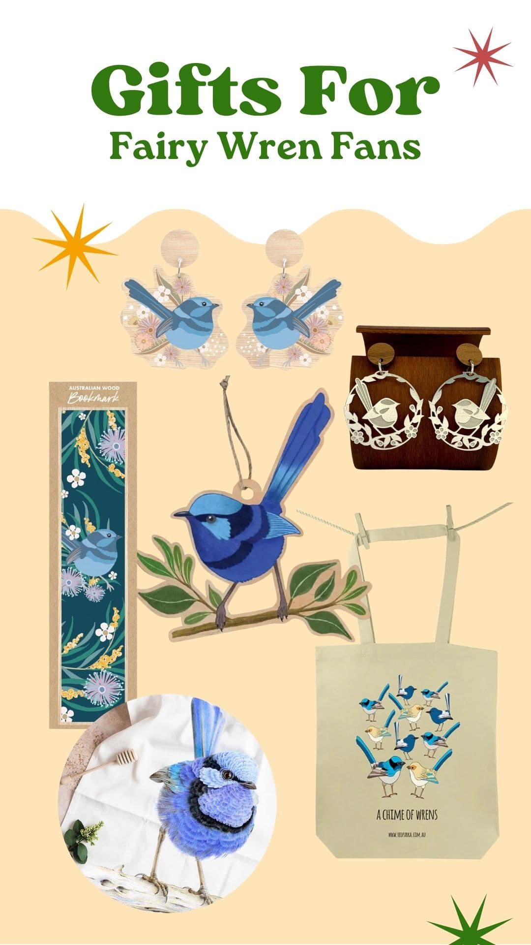 Enamel pins, earrings, printed accessories, ornaments, greeting cards, and socks make standout gifts. They capture the whimsical charm of fairy‑wrens while supporting eco-conscious Australian makers.