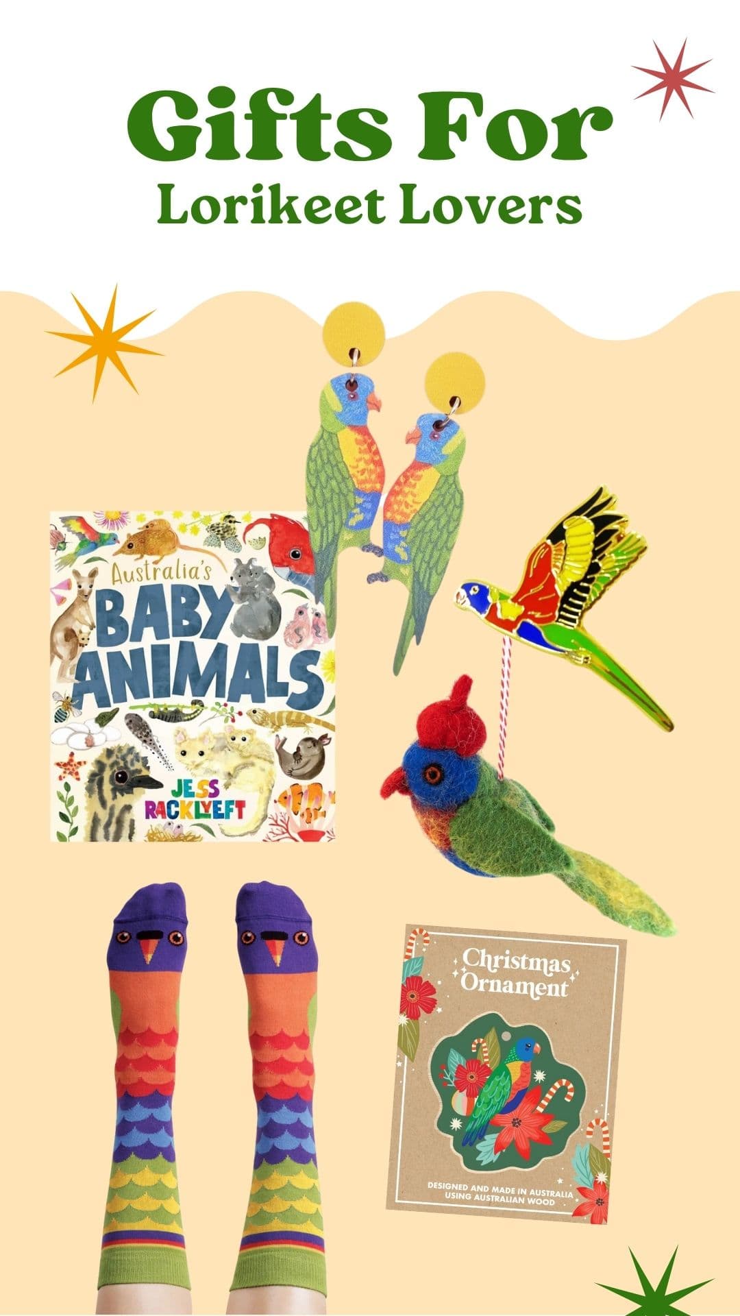 Standout gifts include enamel pins, colourful socks, earrings, decorative ornaments, greeting cards, and printed wrapping paper — all designed to reflect the joyous spirit of lorikeets while supporting eco-conscious makers.