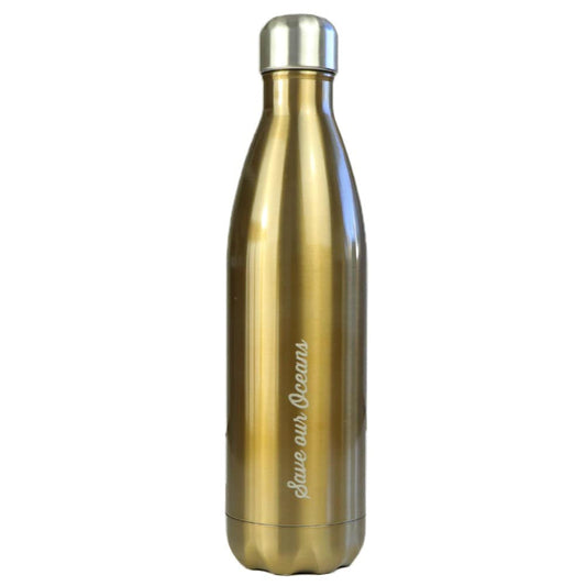 BBBYO Stainless Steel Water Bottle with Cover 750ml - Gold Spiral. This stainless steel water bottle is insulated to keep liquids hot for 12 hours and iced drinks cold for 24 hours. Featuring a 750ml metallic gold bottle with a spiral-design neoprene sleeve for extra insulation and protection against bumps and scratches. Save waste, stay hydrated and keep our beaches beautiful.