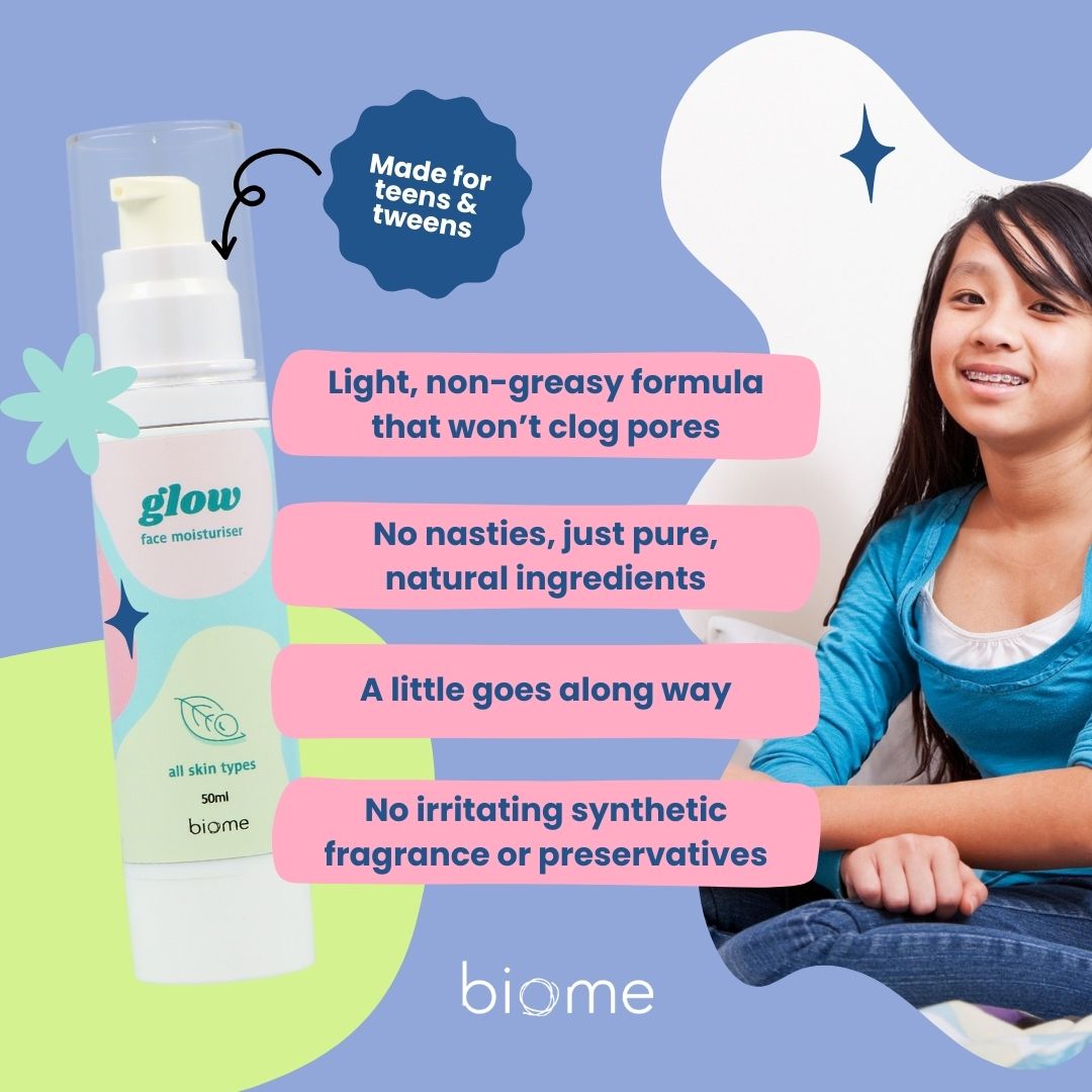 "Glow On" moisturiser for tweens and teens gently nourishes young, sensitive skin with calming and lightweight natural ingredients, free from harsh chemicals like retinol, AHAs, and BHAs that are for adult skin.
