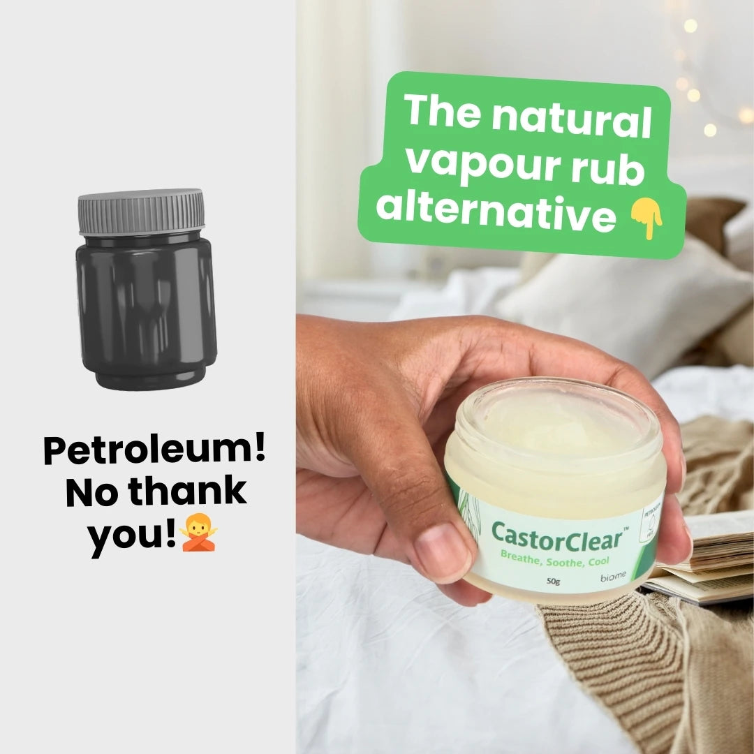 CastorClear is a natural alternative to petroleum-based vapour rubs, made with castor oil and essential oils like eucalyptus, menthol, peppermint, and lemon myrtle, rather than petroleum jelly and other synthetic ingredients. While we don’t make therapeutic claims, CastorClear can be used as part of your winter wellness rituals in similar ways.