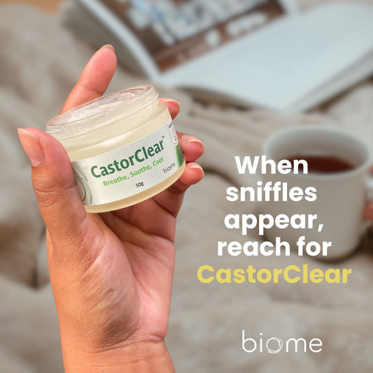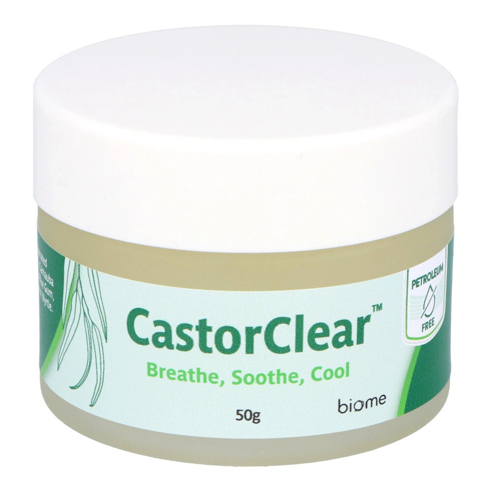 CastorClear is a petroleum-free balm designed for multi-purpose self-care. Use it as part of your bedtime routine as a chest rub, add a small amount to hot water for a steam inhalation ritual, or massage into your neck and shoulders to wind down at the end of the day. It’s a clean, plant-based alternative to conventional vapour-style balms (such as Vick's VapoRub).