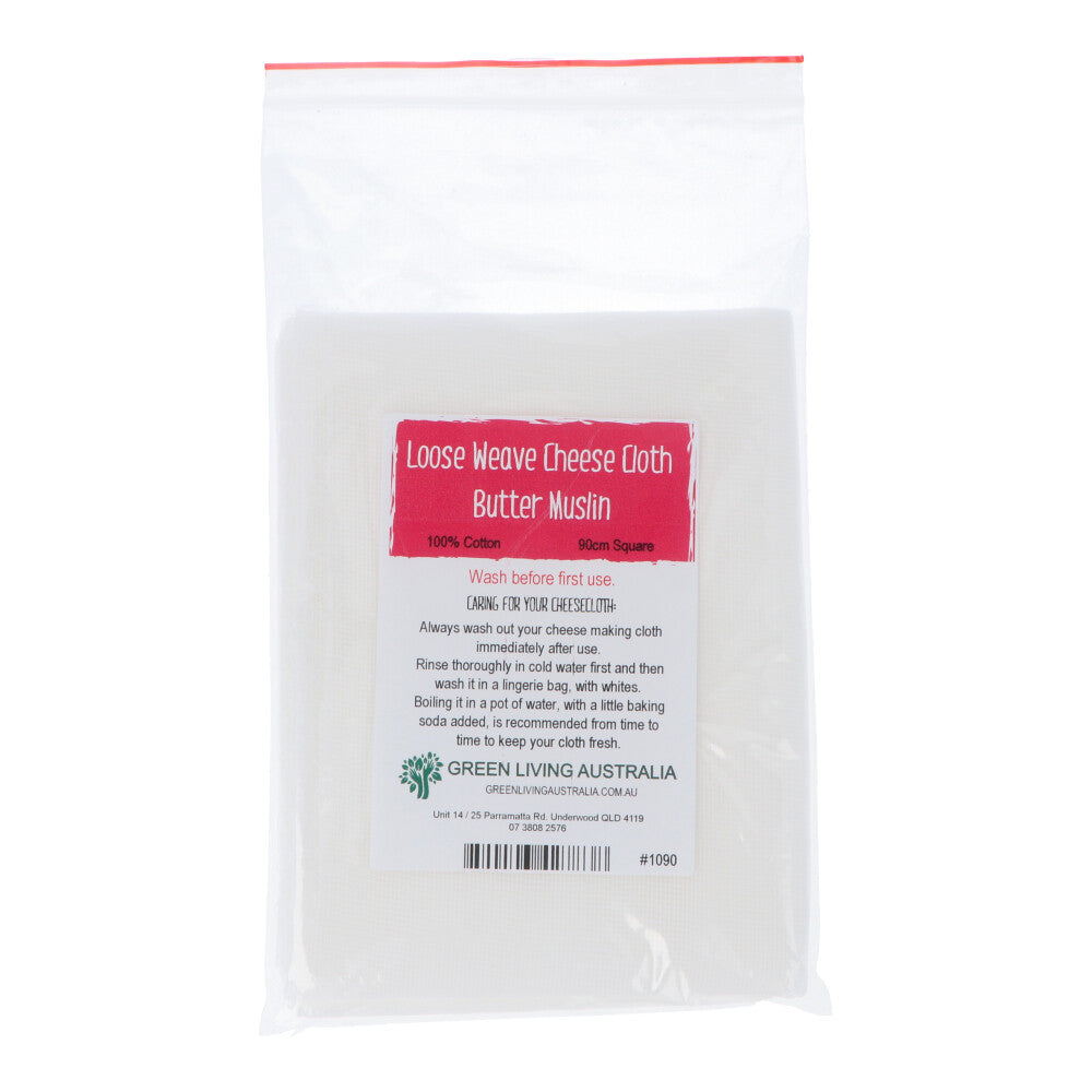 Green living butter muslin cheese cloth - loose weave 90cm x 90cm. Excellent quality 100% cotton butter muslin cheese cloth with a loose weave for making hard cheeses. Washable and reusable. 90cm x 90cm square.