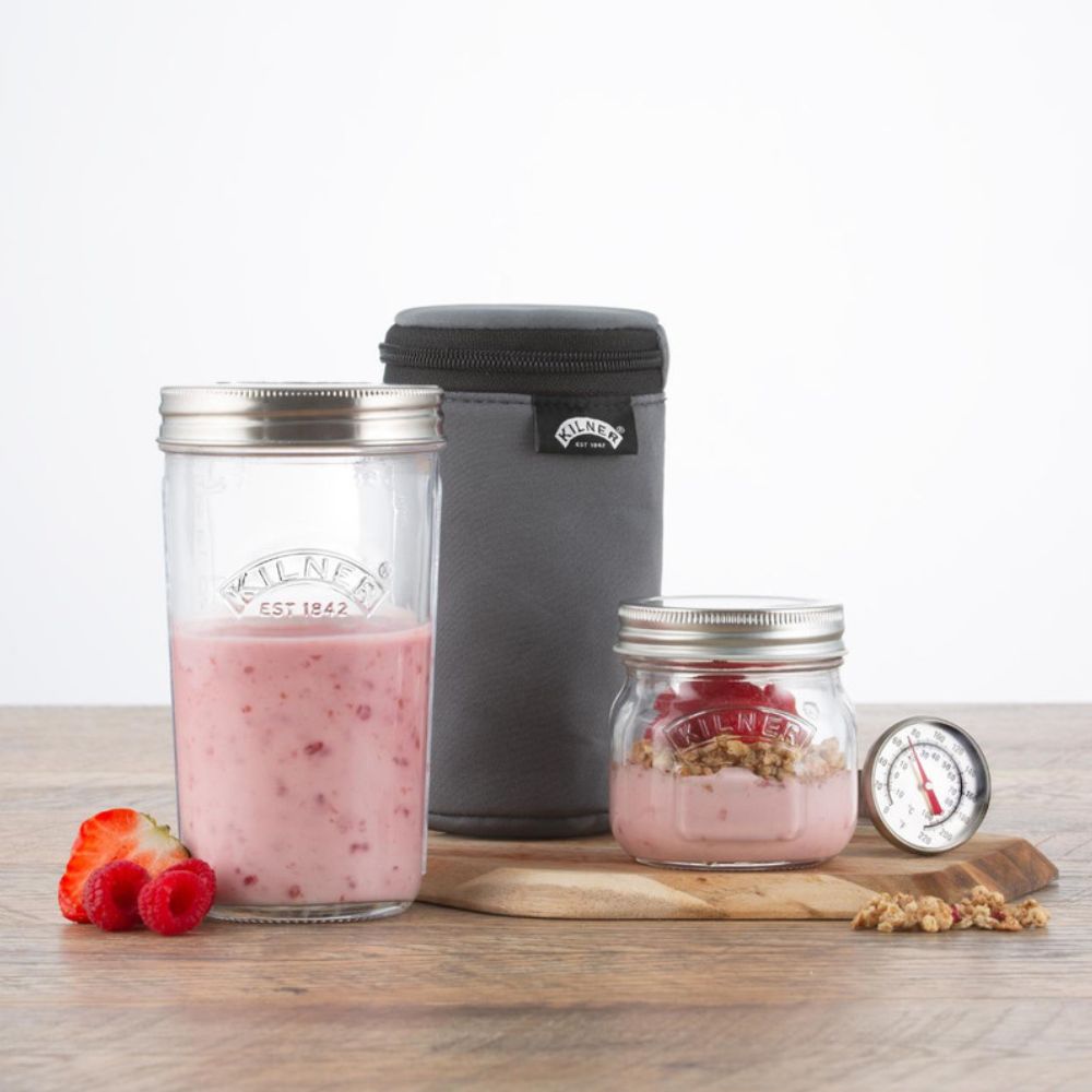 Kilner Yoghurt Making Set - 500ml. This DIY yoghurt making set comes complete with a 500ml wide mouth jar, a 250ml jar, an insulating pouch, a stainless steel thermometer and two metal screw-on lids. Find out first-hand how simple, rewarding and economical making your own yoghurt is!