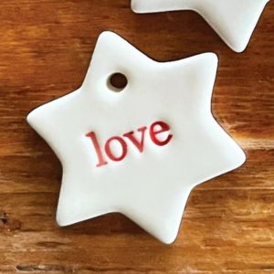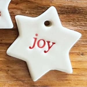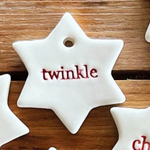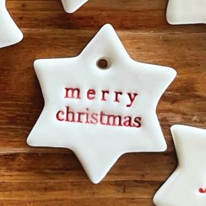 One handmade ceramic star ornament with either Christmas words or an image on the front.