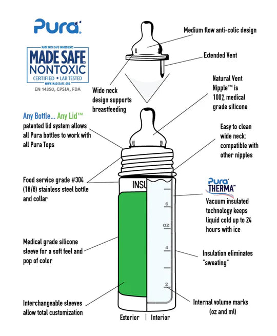 • Fitted with a medium flow Pura Natural Vent Nipple™ crafted from 100% medical grade silicone.