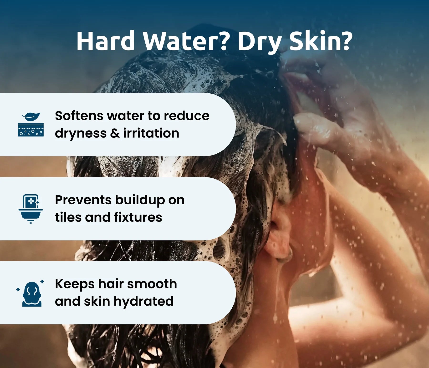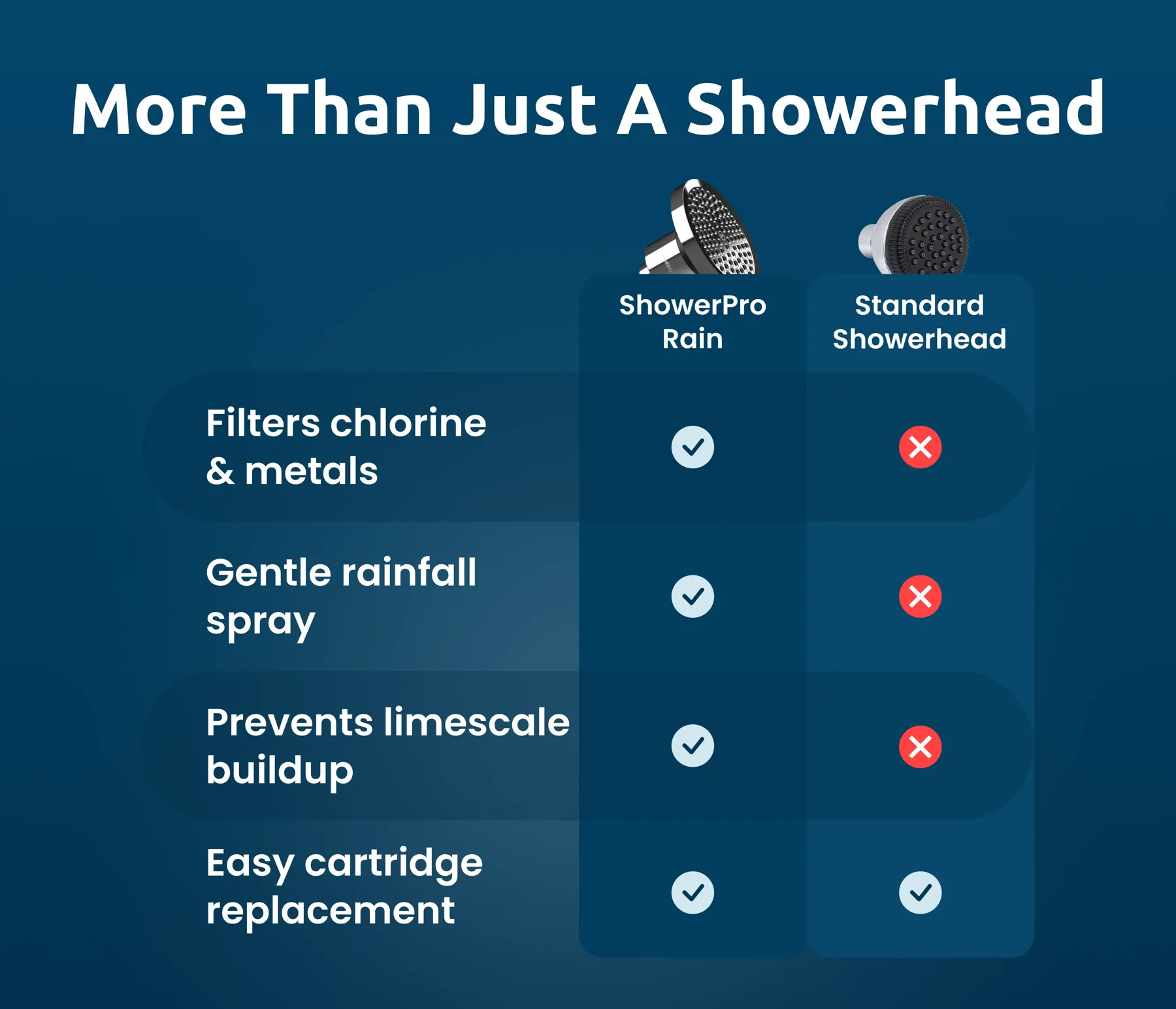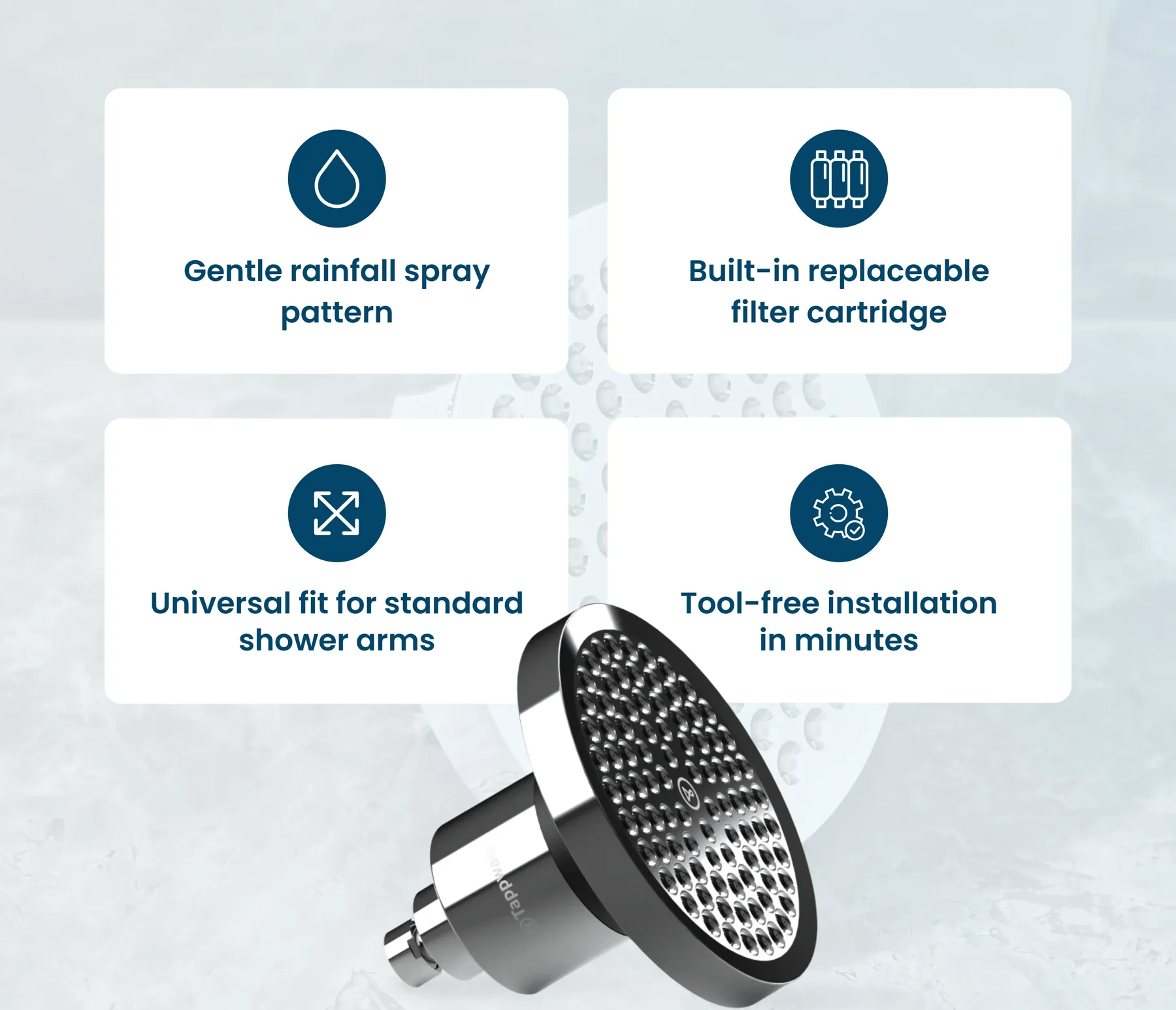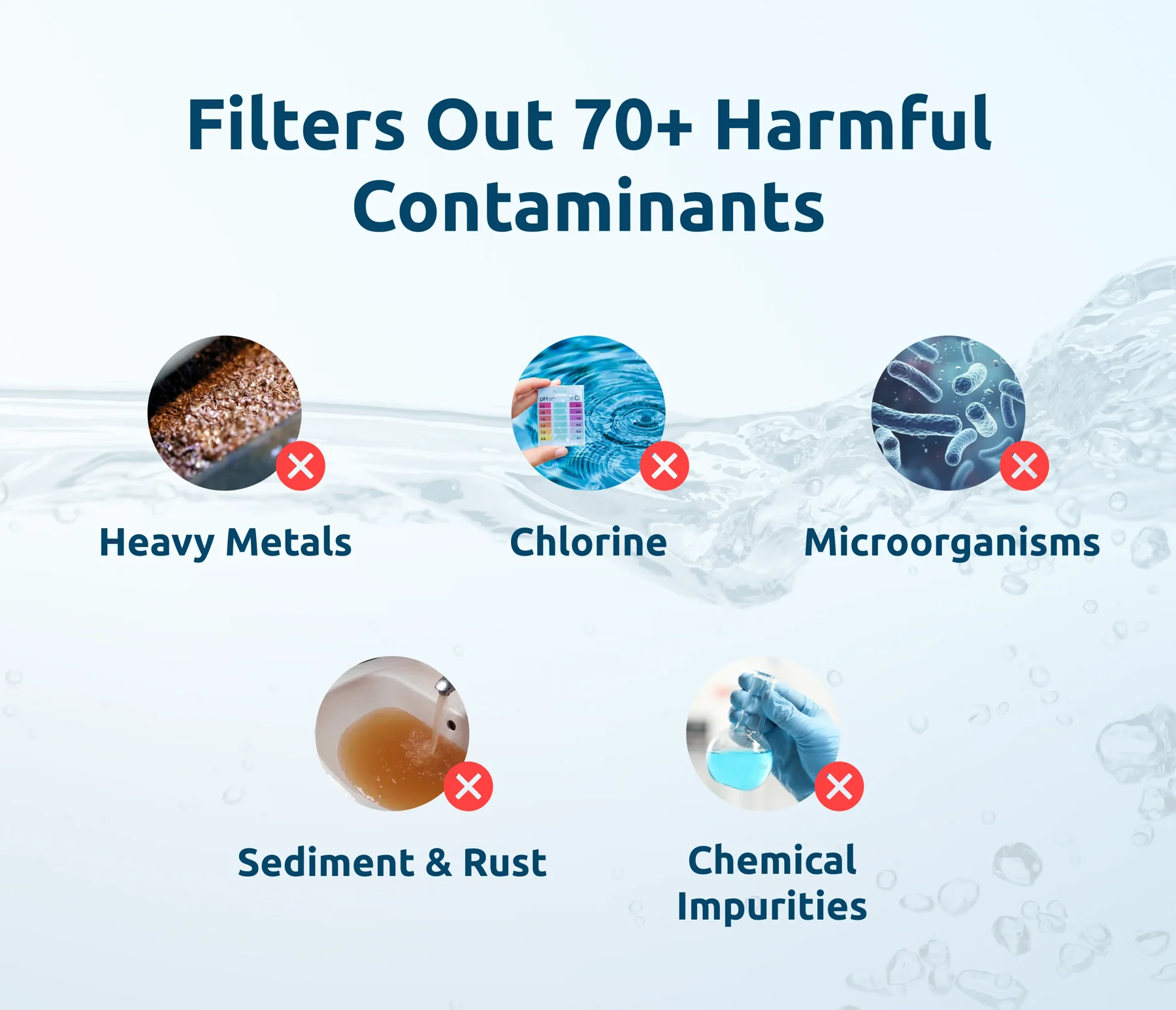 • Removes 70+ substances from your shower water, including chlorine, heavy metals, limescale, THMs and mould