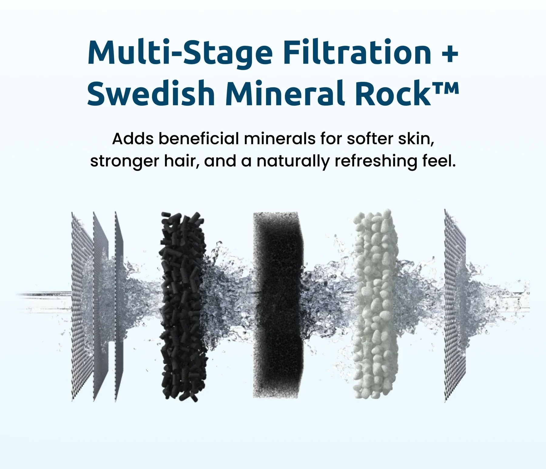 • 5-Stage microfiltration that includes KDF-55, Calcium-Sulfite, Crystal Quartz Mineral, Metallic Mesh, Polypropylene Fabric and Swedish Mineral Rock