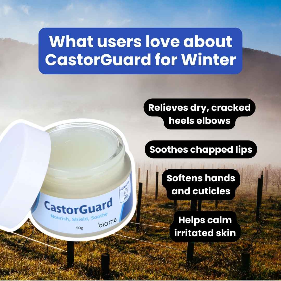 Support your whole-body self-care this winter—naturally. This Winter Care Bundle combines two of Biome’s most loved petroleum-free balms to help you stay comfortable, hydrated, and refreshed as the temperature drops. The Winter Care Bundle pairs CastorGuard, our all-purpose skin barrier balm, with CastorClear, a multi-use vapour-style balm. Both are petroleum-free, made with plant-based ingredients, and crafted by us in Australia with care. No synthetic fragrance. No nasties. Just natural protection and comfort for cooler days.