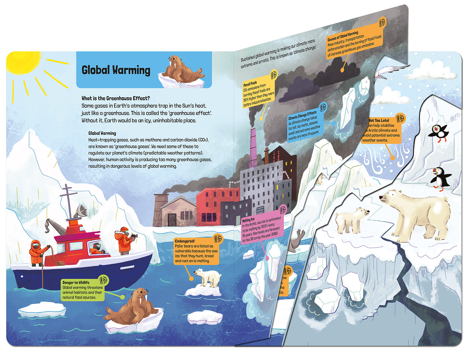 With mind-blowing facts to discover and scenes that transform with the turn of each die-cut page, there's plenty to explore and learn about climate-change and the things that are putting our planet at risk. From global warming, pollution, fossil fuels and energy to food production, farming and learning to live with less, you'll not only learn about the impact of planet-harming activities, you'll learn about the positive things that you can do, like reducing pollution, using renewable energy and sustainable living, so that you will be inspired to help save the Earth.