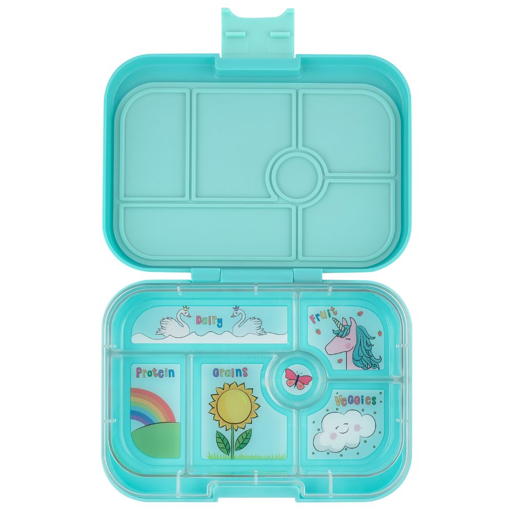 Yumbox is a kid friendly bento box lunch box with a single leak proof lid. PVC free, BPA free.